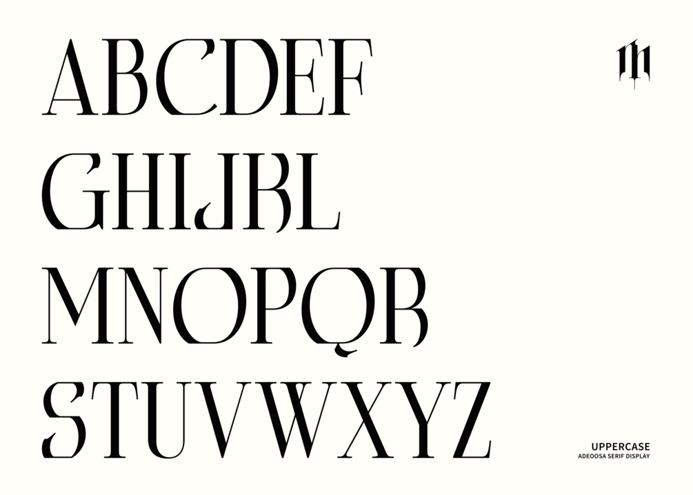 Adeoosa is a serif font that blends masculine strength with modern elegance. Featuring serif details and a subtle Gothic touch, Adeoosa strikes a unique balance between classic style and contemporary flair. Its sophisticated and commanding presence makes it perfect for a variety of applications, including standout logotypes, attention-grabbing poster headers, stylish magazine layouts, and premium brand apparel.
